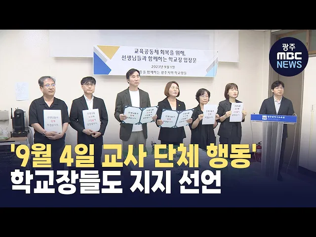 광주지역 일부 교장들이 9월 4일 열리는 '공교육 멈춤의 날 행사'를 지지하겠다고 밝혔습니다. 광주지역 초중등, 특수학교 교장 38명은 오늘(1) 입장문을 내고 "9월 4일, 교사들의 집단 행동은 교사들의 교육권과 학생들의 배움의 권리를 지켜내기 위한 정당한 움직임'이라고 밝혔습니다. 한편, 서이초 교사의 49재를 맞아 ...