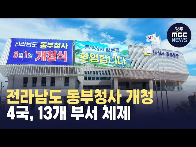 전라남도 동부청사 개청식이 오늘 순천에서 열렸습니다. 전라남도 동부청사는 동부출장소로 출발한 뒤 동부지역본부로 개편됐으며 이번에 4국, 13개 부서 체제를 갖추고 최근 청사 완공과 부서 이전을 마무리했습니다. 동부청사에는 스마트민원실, 다목적 대강당, 북카페, 숲 쉼터 등 소통과 휴식 공간도 마련됐습니다.