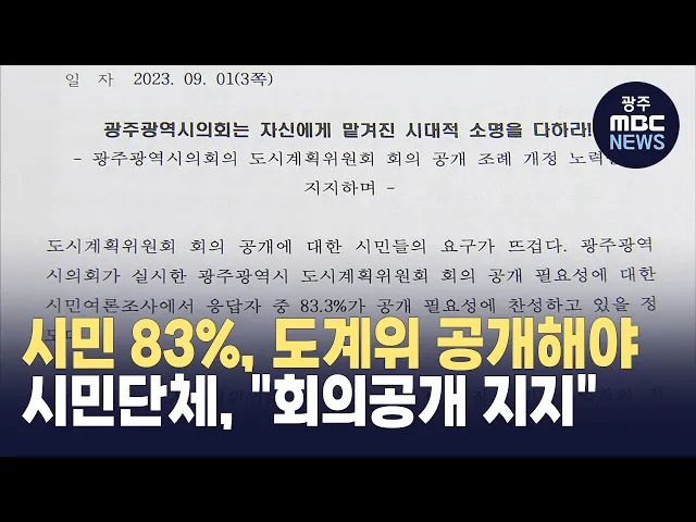 광주시민단체들이 광주도시계획위원회의 공정성과 투명성을 위한 회의공개 조례 개정을 지지한다고 밝혔습니다. 광주시민단체협의회는 오늘(1일) 성명서를 내고 "도계위 회의 공개에 대한 시민들의 요구가 뜨겁다"며 "공개 필요성에 대한 시민여론조사에서 응답자 중 83.3%가 공개 필요성에 찬성하고 있다"고 주장했습니다....