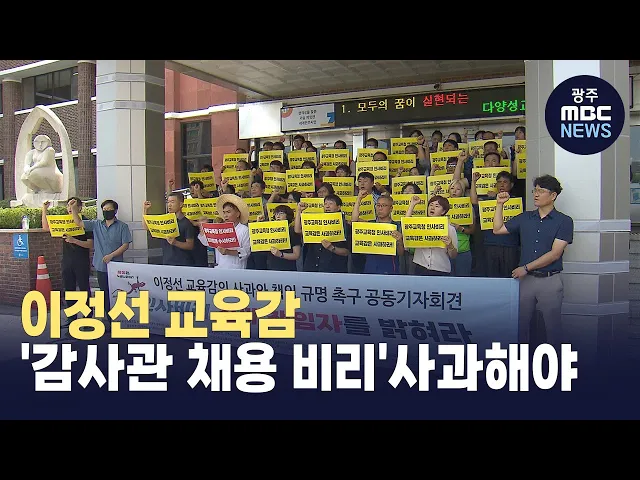 광주 시민사회단체가 시교육청 감사관 채용 비위와 관련해 이정선 교육감의 사과의 책임자 처벌을 촉구했습니다. 전교조 광주지부 등 37개 교육,시민단체는 공동기자회견을 열고 감사관 채용과정의 비위가 감사원 감사를 통해 드러난만큼 교육감이 공식 사과하고 경찰에 자진 출두해 조사를 받으라고 요구했습니다. 이정선 ...