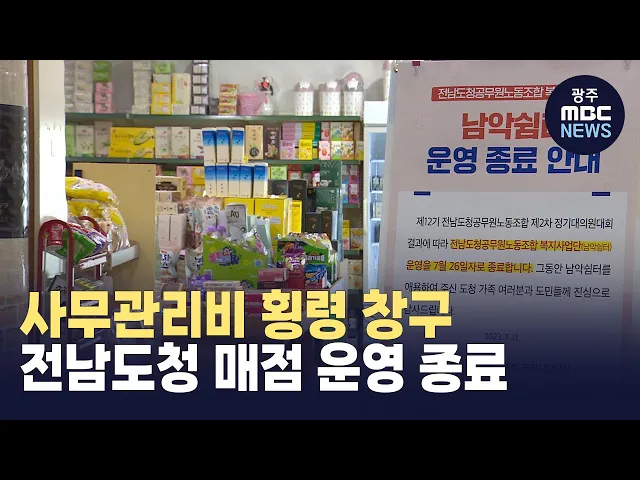 (앵커) 전남도청 공무원들의 사무관리비 횡령 창구로 이용됐던 곳이 도청 내 매점입니다. 이 매점 운영은 전남도청 공무원노조가 맡아왔는데 오는 26일부터 매점 운영을 중단하기로 했습니다. 이 과정에서 전라남도는 도대체 어떤 역할을 했는지 의문입니다. 김진선 기자가 취재했습니다. (기자)전남도청이 남악으로 이전한...