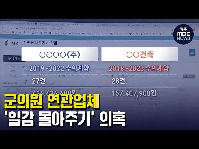 (앵커) 해남군의원 연관업체에 최근 4년동안 2천만원 이하 수의계약이 집중됐다는 의혹이 제기됐습니다. 당사자는 의혹을 전면 부인하고 있는데 경찰이 수사에 나섰습니다. 신광하 기자가 보도합니다. (기자) 해남군의회 부의장인 서해근 의원이 지난해 6월 지방선거때 사용했던 사무실입니다. 간판 없는 1층 가게지만 안으...