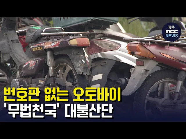 (앵커) 영암 대불산단이 번호판 없는 오토바이들의 '무법천국'이 되고 있습니다. 공장 노동자들이 출퇴근 용으로 주로 이용하고 있는데 각종 사고에 노출돼 있고 사고가 나면 보험 처리가 어렵습니다. 하지만 경찰 등 관계기관들은 사실상 단속에 손을 놓고 있습니다. 안준호 기자가 현장 취재했습니다. (기자) 이른 아침 ...