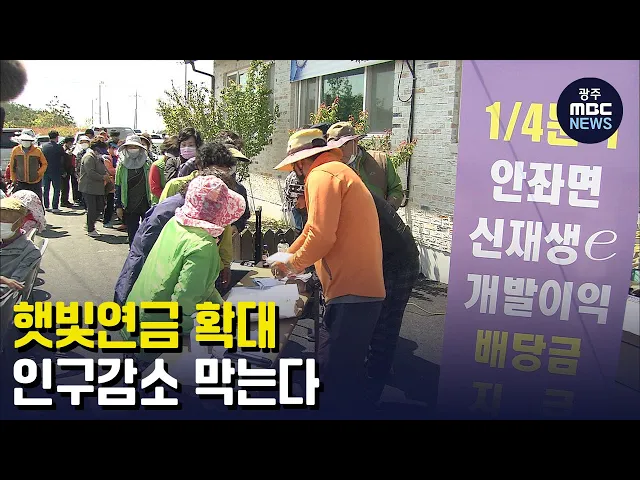 (앵커) 신안에서 태양광 수익금을 주민들에게 나눠주는 이른바 '햇빛연금' 수익자가 늘어나고 있습니다. 햇빛연금을 받은 섬 지역 인구도 증가하고 있어 인구소멸 위기를 극복하기 위한 좋은 사례로 주목받고 있습니다. 김 윤 기자가 취재했습니다. (기자) 축구장 백20개 크기인 98만여 제곱미터의 폐염전 부지에 태양광 발...