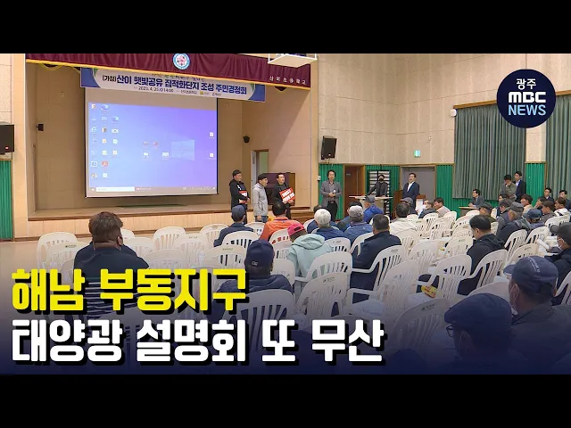 (앵커) 해남에서는 태양광 발전사업을 둘러싸고 찬성과 반대측 주민들의 갈등이 심각합니다. 해남 부동지구 태양광 발전사업 주민의견 경청회가 반대측 주민들의 반발로 또다시 무산됐습니다. 신광하 기자가 보도합니다. (기자) " 시작하지 마세요.. 들어는 봐야 할 것 아니야!" 해남군 산이면 부동지구에 500MW 규모의 태...