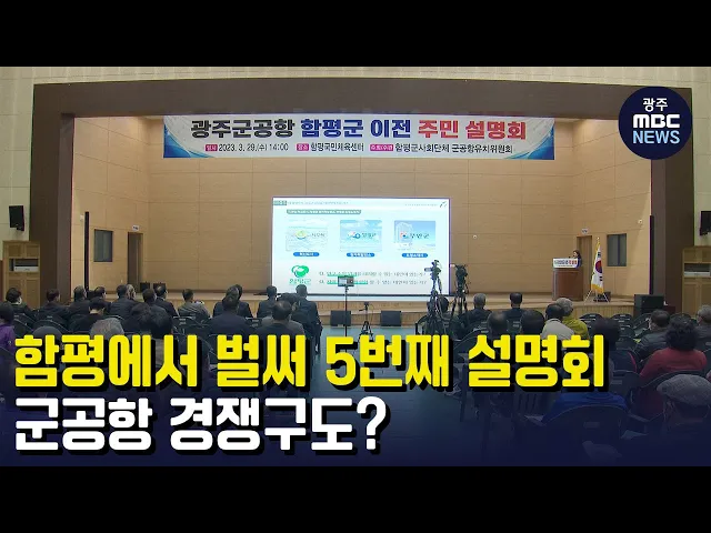 (앵커) 김영록 전남지사의 군 공항 이전 관련 발언으로 광주군공항 이전 사업이 경쟁구도로 변하고 있습니다. 무안군에서는 대규모 반대 집회가 열린데 반해, 함평군에서는 5번째 군공항 이전 설명회가 열렸습니다. 신광하 기자가 보도합니다. (기자) 함평군에서 광주군공항 유치를 위한 설명회가 또 다시 열렸습니다. 함평...