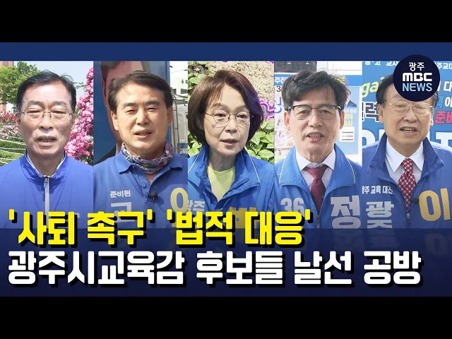 (앵커) 이번 지방선거에서 5파전으로 치러지는 광주시교육감 후보 경쟁이 어느때보다 뜨겁습니다. 후보들은 상대 측의 자질에 문제가 있다며 날선 공방을 이어가고 있는데요. 일각에선 "사퇴를 촉구한다", "법적 대응을 하겠다" 는 등 으름장이 오가면서 선거 과열 양상도 나타났습니다. 이다현 기자입니다. (기자) 지방선...
