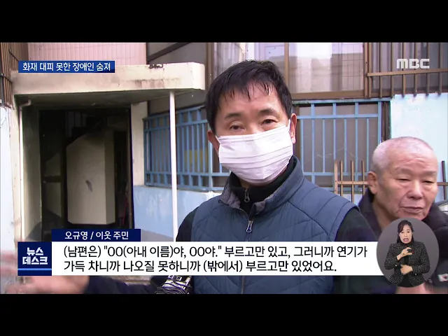 (앵커) 크리스마스 연휴인 오늘(26) 새벽 주변 도움없인 움직일 수 없는 40대 여성이 집에 불이 났지만 미처 대피하지 못해 숨졌습니다. 기초수급 가정인 집에는 남편이 있었지만 잠결에 집을 빠져나온뒤 연기로 가득 차 밖에서 지켜볼 수밖에 없었다고 합니다. 우종훈 기자가 취재했습니다. (기자) 광주 남구의 한 연립주...