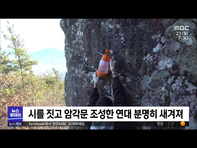◀ANC▶ 1910년 한일합병 당시 느낀 울분을 바위에 새긴 암각문이 장흥의 한 산봉우리에서 발견됐습니다. 암각문을 조성한 연대가 분명이 새겨져 있어 사료적 가치가 큰 것으로 평가받고 있습니다. 김양훈 기자가 보도합니다. ◀END▶ 전남 장흥군 부산면 자미마을 뒷산입니다. 해발 412m의 산 정상 수리봉에서 암각문이 ...