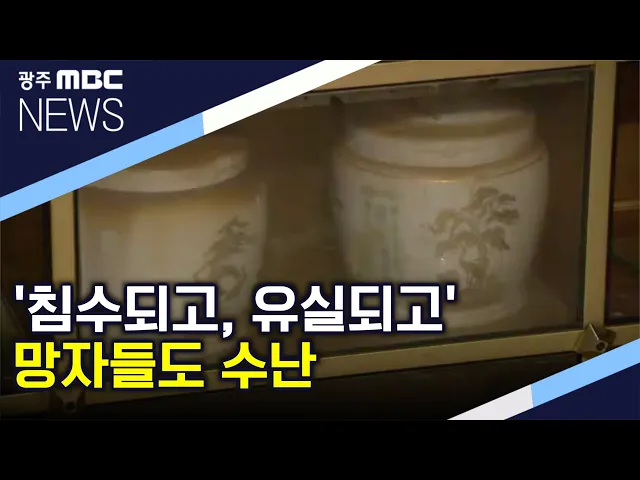 (앵커) 광주*전남의 기록적인 폭우 때문에 망자들도 수난입니다. 침수된 납골당에선 유골이 무더기로 물에 잠겨 재화장 행렬이 이어졌고, 시립묘지와 국립518민주묘지도 토사 유출 피해를 입었습니다. 우종훈 기자가 취재했습니다. (기자) 광주 북구의 한 화장장. 침수된 추모관에서 가족의 유골함을 챙겨나온 유족들로 가...