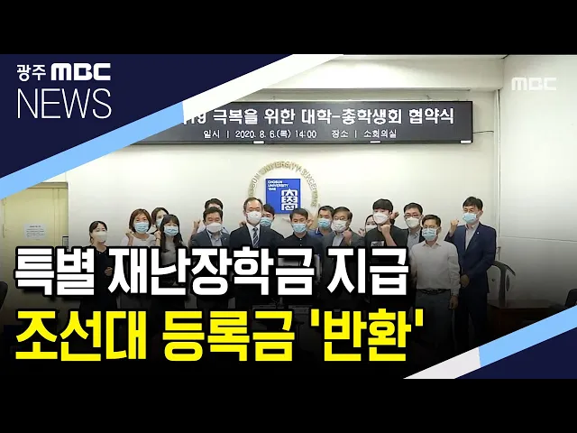 (앵커) 코로나19 탓에 대학들이 정상수업을 하지 못하면서 등록금을 돌려달라는 학생들의 요구가 거센데요, 조선대학교가 광주,전남에서 처음으로 등록금 반환을 결정했습니다. 다른 대학들에게 어떤 영향을 미칠지 주목됩니다. 남궁 욱 기자가 취재했습니다. (리포트) 조선대학교 총장과 총학생회장이 2학기 등록금 인하에...
