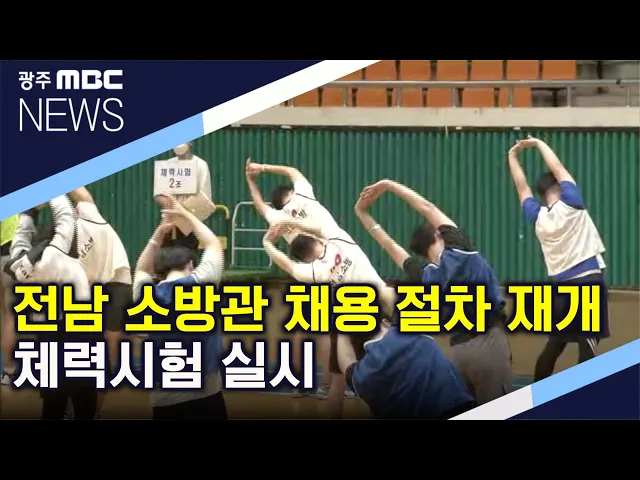 ◀ANC▶ 코로나 19로 두차례 연기됐던 전남 소방관 채용 절차가 재개됐습니다. 그동안 체력을 다져온 8백여 명의 필기시험 합격자들은 합격의 각오를 다지며 시험장에 나섰습니다. 김안수 기자가 현장 취재했습니다. ◀END▶ 목포실내체육관 앞에 건장한 청년들이 줄 지어 서있습니다. 체력시험을 앞두고 있는 소방공무원...
