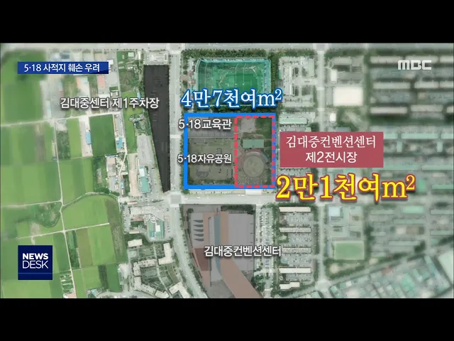 (앵커) 김대중컨벤션센터 제 2전시장이 5.18 자유공원 안에 건립되는 쪽으로 가닥이 잡히고 있습니다. 5.18 사적지 훼손 등을 이유로 반대했던 5월 단체들이 일단 공감하는 분위기가 만들어졌지만, 역사공원 절반 가량이 사라지는 상황이라 반발도 만만치않을 것으로 보입니다. 이계상 기자.. (기자) 김대중컨벤션센터 맞은...