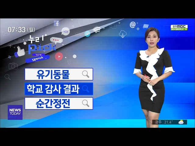 (뉴스리포터) 한 주간 누리꾼들의 관심사를 키워드로 정리해보는 누리픽 시간입니다. 지난 한 주, 어떤 키워드가 많은 관심을 받았을까요? 유기동물, 학교 감사 결과, 순간정전 이 있었습니다. 어떤 내용인지, 먼저 유기동물 부터 살펴보겠습니다~ -------------------------------------------- ◀ V C R ▶ 지난 한 해 광주...