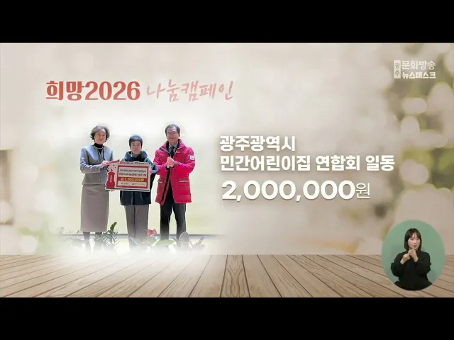 다음은 '희망 2026 나눔 캠페인' 에 성금을 보내주신 분들입니다.광주광역시 민간어린이집 연합회 일동2,000,000 원을 보내주셨습니다.어려운 이웃돕기에 함께 해주셔서 감사합니다.