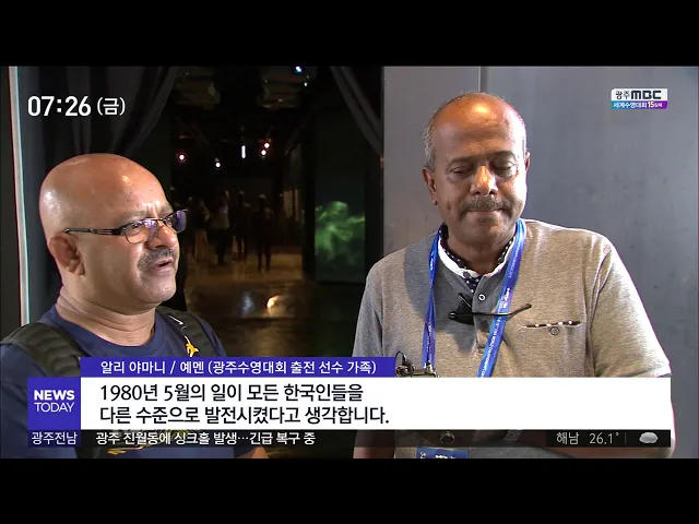 (앵커) 세계수영대회 때문에 광주를 찾은 외국인들이 5.18 사적지에서 '광주의 5월'을 알아가고 있습니다. 외국인들의 눈에는 5.18이 어떻게 비쳐졌는지, 우종훈 기자가 만났습니다. (기자) 수영 대회에 참가한 자국 선수들의 통역을 위해 광주를 찾은 말레이시아인 양광걸씨가 5월 영령 앞에 고개를 숙입니다. 광주를 찾기...