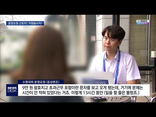 (앵커) 광주 세계수영대회 경기장에서 경기 운영을 보조하는 이들은 최저 시급보다 적은 돈을 받고 하루 최대 12시간 동안 일하고 있습니다. 운영요원들의 불만이 터져나오고 있는데 수영대회 조직위원회는 자원봉사자라서 문제될 게 없다고 반박하고 있습니다. 보도에 남궁 욱 기자입니다. (기자) 아티스틱 수영 경기가 끝...