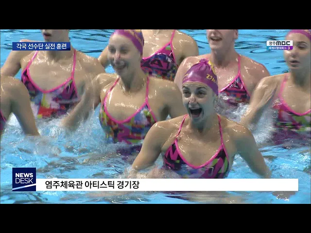 (앵커) 광주 세계수영선수권대회가 초읽기에 들어가면서 선수들은 사실상 메달 경쟁에 들어갔습니다. 일찌감치 광주를 찾은 각국 선수들은 경기장에서 실전 감각을 익히며 막바지 훈련을 하고 있습니다. 이계상 기자... (기자) 대형 수조 안으로 뛰어든 선수들이 경쾌한 음악에 맞춰 칼군무를 선보입니다. 팀원들은 물속에...