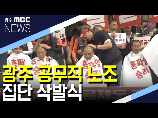 8일째 총파업 중인 자치구 공무직 노동자들이 오늘(8일) 광주시청 앞에서 집단 삭발식을 갖고 즉각적인 교섭을 요구했습니다. 삭발식에 참석한 자치구 공무직 노조는 퇴지금 가산제 도입과 유아 휴직 사용 등 공무직 차별 철폐를 위해 광주시와 자치구가 수영대회 개막 전에 집중 교섭에 나서라고 촉구했습니다.