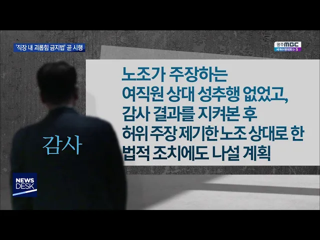 (앵커) '미투' 열풍 이후에도 직장내 성희롱과 성추행은 사라지지 않았습니다. 최근에는 나주 혁신도시 공공기관과 광주 남구청에서 성희롱 문제가 불거졌는데요. 직장 내 성희롱 등 갑질 문화를 근절하기 위한 '직장 내 괴롭힘 방지법'이 오는 16일부터 시행됩니다. 우종훈 기자 보도합니다. (기자) 한국 농수산식품유통공...