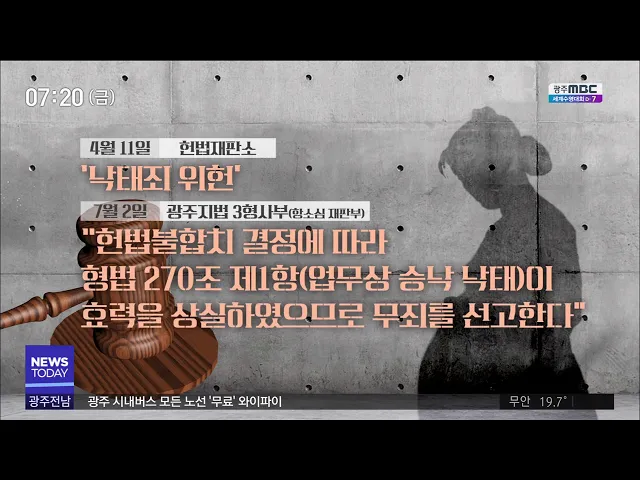 (앵커) 지난 4월 낙태죄가 위헌이라는 헌법재판소 결정 이후 낙태죄로 재판에 넘겨진 의사가 처음으로 무죄판결을 받았습니다. 검찰도 낙태 여성에 대해 기소유예처분을 하는 등 헌재 결정에 따른 변화가 계속되고 있습니다. 김철원 기자입니다. (기자) 광주의 한 산부인과 의사인 정 모씨는 2013년 11월부터 2015년 7월까...