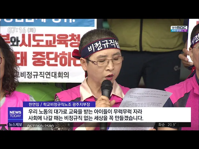 오늘의 주요뉴스... 학교 비정규직 노조의 총파업으로 모레부터 학교 급식에 차질이 우려됩니다. 다른 공공부문에서도 비정규직 차별을 철폐하라는 단체행동이 잇따르고 있습니다. ------------------------------------------- 남북미 정상의 역사적인 판문점 회동을 계기로 광주세계수영대회에 북한이 참가할 수 있다는 ...
