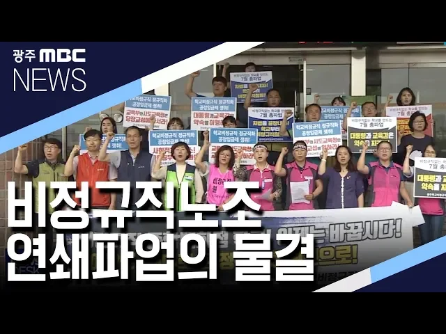 (앵커) 학교 비정규직 노조가 모레(3)부터 총파업에 들어가면서 학교 급식과 돌봄교실 운영 등에서 일정 부분 차질이 불가피해졌습니다. 학교 뿐만 아니라 다른 공공부문에서도 비정규직 차별을 없애라는 요구가 잇따르고 있습니다. 김철원 기자 (기자) 광주지역 학교 비정규직 노동자들이 임금 인상 등 처우 개선을 요구하...