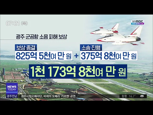 오늘의 주요뉴스... 광주 도시철도 2호선 착공이 세계 수영대회가 끝나는 8월 하순쯤으로 미뤄졌습니다. ------------------------------------------- 광주 군공항 이전이 늦어지면서 소음 피해 보상금이 천문학적 수준으로 늘어나고 있습니다. 국방부가 군공항 이전과 소음 피해 대책에 너무 소극적이라는 지적이 나오고 ...