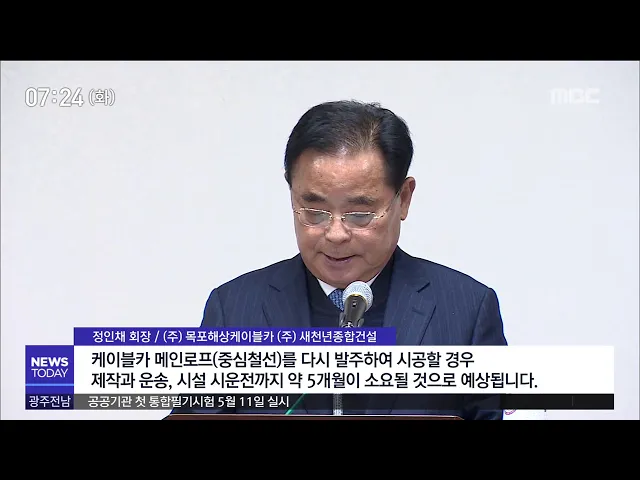 ◀ANC▶ 목포 해상케이블카 개통이 5월에서 10월로 또 다시 연기됐습니다. 지금까지 3번째인데 기술적인 문제를 떠나 신뢰와 안전에 대한 본질적인 우려도 높아지고 있습니다. 장용기기자 ◀END▶ 해상케이블카 회사 관계자들이 기자회견을 통해 개통이 연기된 배경을 설명했습니다, 지난 2일 케이블카 철제밧줄 제작사인...
