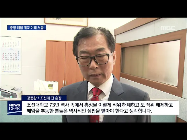 (앵커) 지난해 대학 평가 이후 조선대는 극심한 내부 갈등을 겪고 있습니다. 최근에는 교수들의 비위 의혹까지 잇따라 터졌습니다. 위기 의식을 느낀 이사회가 개교 이래 처음으로 총장을 해임했습니다. 보도에 송정근 기자입니다. (기자) 조선대 이사회가 지난해 11월부터 직위해제된 강동완 총장의 해임안을 의결했습니다...
