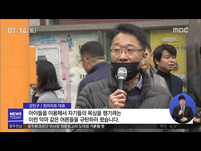 (앵커) 전두환씨가 광주지법에 출석한 지난 11일 그 모습을 지켜보던 초등학생들이 "전두환은 물러가라"를 외쳐 화제가 된 바 있습니다. 이걸 두고 한 극우단체가 어른들이 아이들을 정치적으로 이용했다며 학교 앞에서 항의 회견을 열었는데요, 시민들과 학교측의 반응은 싸늘했습니다. 보도에 남궁 욱 기자입니다. (기자)...