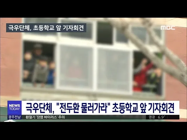 지난 11일 광주지법에서 열린 전두환 재판 도중 인근 초등학교에서 수업중이던 학생들이 "전두환은 물러가라"고 외친 것과 관련해 극우단체가 항의 기자회견을 예고했습니다. 광주 동부경찰서에 따르면 오늘(15) 오전 광주 동산초등학교 앞에서 자유연대 등 극우단체 회원 10여명이 항의 기자회견을 열 계획입니다. 이들은 ...