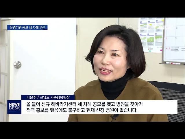 ◀ANC▶ 성폭력과 가정폭력 피해자 등을 지원하는 전남 서부 해바라기센터가 문을 닫을 처지에 놓였습니다. 전라남도가 새로운 운영 기관을 찾고 있지만 맡겠다는 기관이 없어서 공모가 세 차례나 무산됐습니다. 김양훈 기자가 취재했습니다. ◀END▶ 지난 2010년 문을 연 전남서부해바라기센터 성폭력과 가정폭력 피해자...