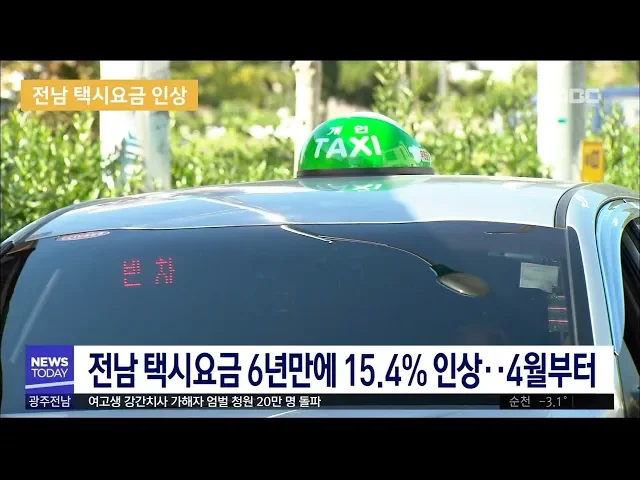 전남지역 택시요금이 6년만에 15.4% 인상됩니다 전라남도 소비자정책위원회는 택시 운임과 요율 조정안 심의를 거쳐 택시요금을 15.4% 인상하는 기준을 마련했습니다 이에 따라 다음달부터 중형택시 기본요금은 현행 2천800원에서 3천300원으로 오르고, 심야 할증은 20%, 사업구역 외 운행은 35% 할증됩니다.