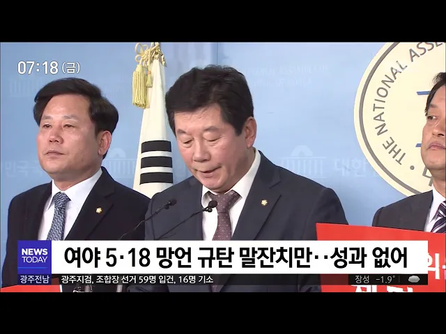 오늘의 주요뉴스... 임시 국회가 개원한 어제 국회 윤리특위가 열렸지만 5.18 망언 의원들에 대한 징계 결정이 미뤄졌습니다. --------------------------------------- 재판 출석을 거부하다 강제 구인장이 발부된 전두환씨가 다음주 월요일 광주에서 열리는 재판에 자진 출석할 것으로 보입니다. -----------------------...