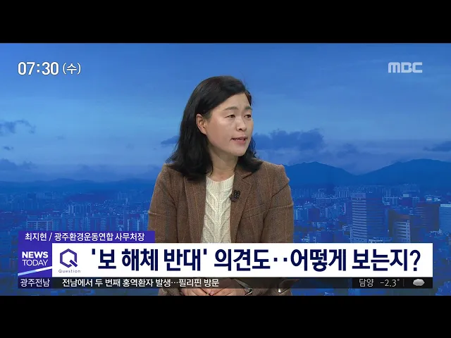 (앵커) 환경부가 조만간4대강 내 보 처리 방안을 발표하겠다고 밝혔습니다. 이에 앞서 광주 시민사회에서는영산강의 승촌보와 죽산보를 해체해야 한다고기자회견을 열기도 했는데요. 최지현 광주환경운동연합 사무처장과자세한 이야기 나눠보겠습니다. 안녕하세요? (네 안녕하세요) ======================================...