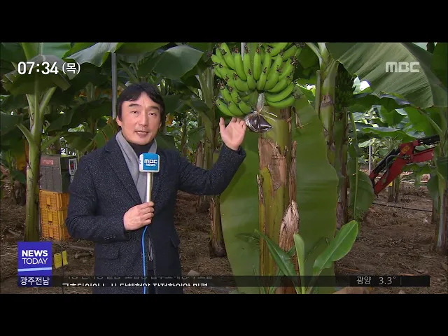 ◀ANC▶ 기후변화로 인해 작물 재배 지도가 바뀌고 있다는 소식은 그동안 여러차례 보도해 드렸는데요. 강진군에서는 요즘 열대과일인 바나나 재배까지 이뤄지고 있습니다. 달라지는 과일 재배, 신광하 기자가 보도합니다. ◀VCR▶ 바깥은 영상 6도의 한 겨울이지만, 비닐하우스 안은 영상 20도 입니다. 열대 숲에 온 것 ...