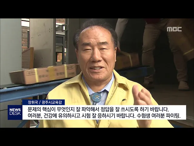 **장휘국 광주시교육감 "문제의 핵심이 무엇인지 잘 파악해서 정답을 잘 쓰시도록 하기 바랍니다. 여러분, 건강에 유의하시고 시험 잘 응하시기 바랍니다. 수험생 여러분 파이팅."