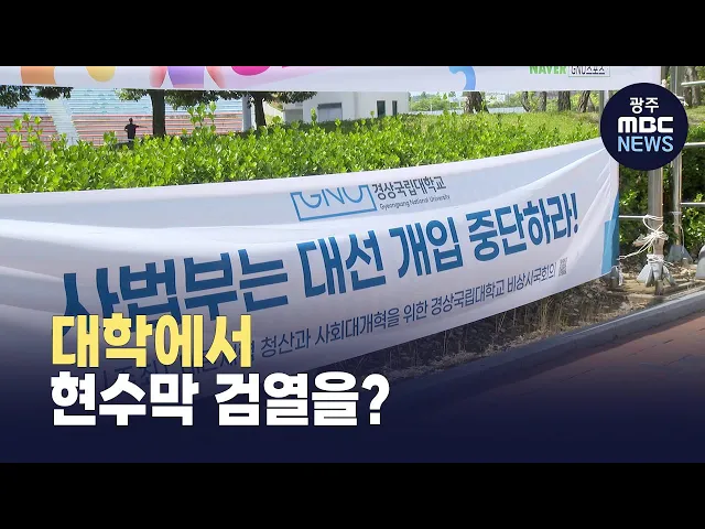 (앵커)경상국립대학교에서 사법부의 대선 개입 중단을 촉구하는 현수막 게시를 두고 대학내 갈등이 빚어졌습니다.대학 측은 내부 규정과 절차를 내세웠는데 당사자들은 표현의 자유가 침해됐다며 반발하고 있습니다.MBC경남 신동식 기자의 보도입니다. (기자)지난 7일 경상국립대학교 민주광장.교수와 학생 145명이 사법부...