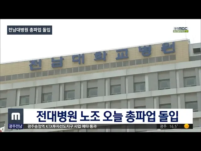 전남대병원 노조가 오늘(12)부터 총파업에 돌입했습니다. 전국보건의료노조 전남대병원지부는 인력 충원과 비정규직의 정규직화 등을 사측에 요구했지만 최종 협상이 결렬됨에 따라 오늘 오전 9시를 기해 무기한 파업에 돌입했습니다. 전대병원측은 파업기간 응급실과 중환자실은 100% 정상 운영되며, 메르스 환자 등 특수...