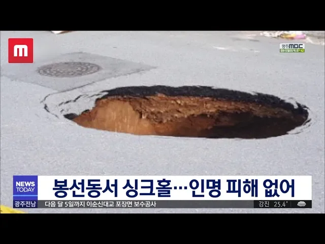 오늘(29) 오후 6시쯤, 광주시 남구 봉선동의 한 주택가 이면도로에서 지름 1.5m, 깊이 3m 가량의 싱크홀이 발생했습니다. 이 사고로 다행히 인명피해는 없었지만 7시간 동안 도로가 통제돼 시민들이 불편을 겪었습니다. 남구청은 하수관 파손으로 물이 새면서 토사가 유출돼 싱크홀이 발생한 것으로 보고 정확한 경위를 조...