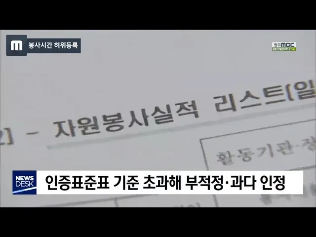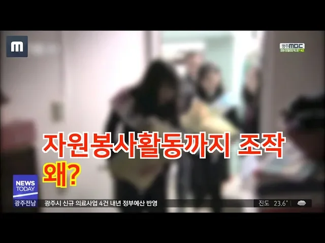 ◀ANC▶ 다음 달 10일부터 대학들의 수시모집이 시작되는 가운데 광주의 시험지 유출과 강남의 쌍둥이 성적 파문 등 학생부와 관련된 사건들이 잇따르고 있습니다. 그런데 이번에는 광주의 한 자치구 자원봉사센터에서 한 자원봉사단체가 중 고등학생들의 봉사시간을 부풀려 등록한 사실이 적발됐습니다. 김인정 기자의 단...