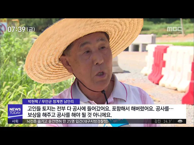 ◀ANC▶ 전라남도가 무안에 시행중인 대규모 하천 재해예방 사업에서 어처구니 없는 일이 벌어졌습니다. 토지 보상도 끝나지 않은 상태에서 공사가 절반이나 진행돼 버린 건데요, 전라남도와 무안군은 서로 책임을 미루고 있습니다. 박영훈 기자가 취재 ◀END▶ 4개 농촌마을을 지나는 무안군의 한 지방하천 입니다. 재해...