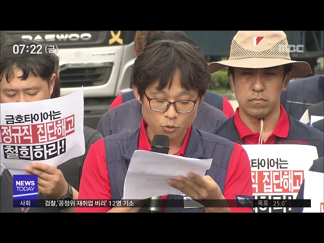 (앵커) 우여곡절 끝에 정상 가동을 시작한 금호타이어가 비정규직 근로자 정리해고 문제로 다시 노사간 갈등을 예고하고 있습니다. 사내하청 업체가 경영난을 이유로 근로자들에게 고통 분담을 요구하자 노조측은 더 이상 물러설 수 없다며 맞서고 있습니다. 이계상 기자.. (기자) -(해고는 살인이다 철회하라!)- 금호타이...