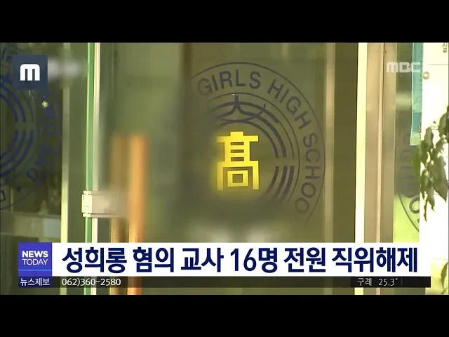 성희롱 혐의를 받고 있는 광주 모 여고 교사 16명이 모두 직위해제됐습니다. 이 학교 재단은 어제(9) 이사회를 열고 성희롱과 성추행 의혹을 받고 있는 교사들을 학생들과 분리할 필요가 있다며 관련자 전원을 직위해제했습니다. 광주시교육청과 해당 학교는 공립학교 파견 교사와 기간제 교사 등으로 빈 자리를 채울 예정...