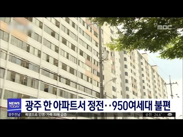 어제(8) 오후 5시 30분쯤, 광주시 동구 산수동의 한 아파트에 전기 공급이 끊겨 주민 950여세대가 1시간 10분 동안 냉방시설을 사용하지 못하는 등 무더위 속에 불편을 겪었습니다. 또 정전으로 인해 아파트 엘리베이터가 멈춰서 주민 4명이 엘리베이터 안에 갇혔다 30분만에 구조됐습니다. 한전은 아파트 차단기 부품에서 ...