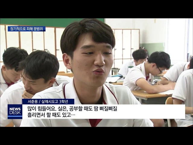 ◀ANC▶ 폭염 피해가 당장은 아니지만 장기간에 걸쳐서 나타날 수도 있습니다. 학업 성적이나 인구 변화에까지 영향을 미친다고 하는데요. 이다솔 기상캐스터가 전해드립니다. ◀VCR▶ 수능시험이 백여 일 앞으로 다가온 고3 교실입니다. 뜨거워진 열정만큼이나 강해진 폭염이 수험생들을 괴롭히고 있습니다. ◀INT▶(살...