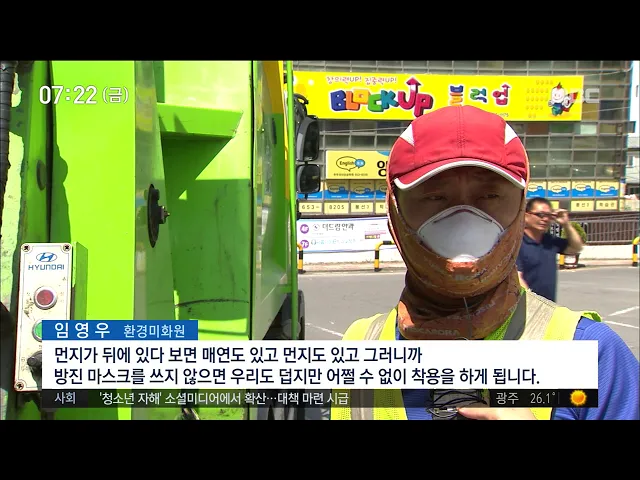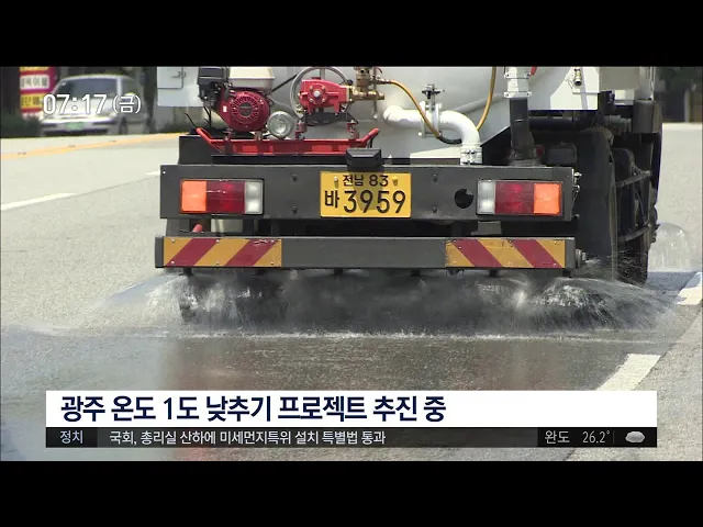 오늘의 주요뉴스 광주시가 도심 열섬 현상을 줄이기 위해 지난해부터 온도 1도 낮추기 사업을 추진하고 있지만, 성과를 거두지 못하고 있습니다. ------------------------------------------- 쾌적한 거리를 만들기 위해 폭염과 사투를 벌이고 있는 환경미화원들의 하루를 취재했습니다. --------------------------------...