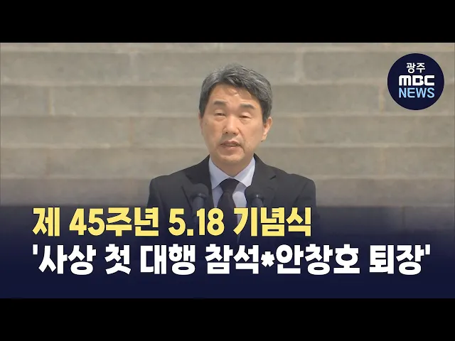 (앵커)제 45주년 5.18민주화운동 기념식이국립 5.18 민주묘지에서 엄수됐습니다.'계엄과 탄핵, 파면' 여파로 사상 처음으로 대통령 궐위 상태에서 기념식이 치뤄졌는 데탄핵 심판을 받고 있던 윤석열 전 대통령의 방어권을 보장하라는 안건을 의결했던안창호 국가인권위원장은 시민들의 항의에 기념식에 참석하지 못했습니...