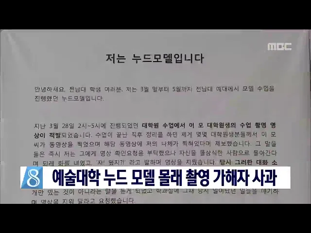 전남대 예술대학원 미술수업에서 누드 모델을 몰래 촬영한 대학원생이 피해자를 만나 사과했습니다. 전남대 예술대학은 피해자 A씨가 가해 여성 B씨로부터 대면 사과를 받았고, 어제 대자보를 자체 수거했다고 밝혔습니다. 학교 측은 가해자의 사과와는 별도로 징계 절차를 밟기로 했고, 수업 개선 약속 등을 담은 학장의 ...